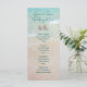Modelo de cardápio alto com fundo de praia tropical e dólares de areia. Um cardápio simples, mas bonito, com água azul e areia da praia como fundo para o texto azul. Nomes da noiva e noiva, com o título "Menu Casamento" na parte superior das placas planas de 4x9 polegadas. Dois, areia natural dólares representam o casal. O texto da parte do menu é adicionado em um parágrafo usando letras maiúsculas para dividir seções, como "aperitivos", "entradas" e "sobremesas". O parágrafo está alinhado ao topo, então adicione espaços onde for necessário ou exclua-os para ajustado do texto do menu. O reverso é um gráfico azul que corresponde à água.