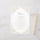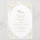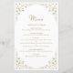 Este elegante cardápio de casamento inspirado na vintage apresenta o texto em um roteiro dourado e fontes serif, enquadrado por um delicado motif vintage de ouro. O quadro é repetido no reverso.