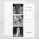 Apresente seu dia de casamento com este cardápio de colagem de fotos sofisticado e sincero. Este design apresenta um layout contemporâneo que combina a elegância de artigos clássicos de núpcias com o moderno toque da fotografia pessoal. O painel esquerdo mostra três slots de fotos cuidadosamente organizados, permitindo que os casais exibam momentos significativos e queridos. O painel direito mantém um design de texto minimalista e elegante, com nomes em uma fonte de script delicada e detalhes essenciais em uma fonte elegante e serif. A paleta de cores preto-e-branco neutra exude sofisticação do eterno e complementa qualquer tema de casamento, do clássico ao moderno. Este convite é perfeito para casais que buscam uma maneira única e pessoal de compartilhar seus detalhes de casamento enquanto mantêm um ar de elegância subestimada. nota: substitua a foto por suas fotos da sessão de fotos pré-casamento. M004