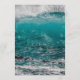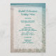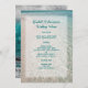 Modelo de cardápio de praia. Areia tropical e fundo marinho com duas modelos de texto em azul-marinho. O título com os nomes do casal está em um script maior. A comida servida, desde aperitivos e bebidas, até ao bolo de casamento e ao bar doce, é apresentada sob a forma de parágrafo. Outra imagem da água do oceano cobrir a parte de trás deste papel de 5 x 7 polegadas. O design é perfeito para qualquer recepção de casamento pelo mar.