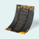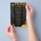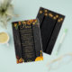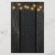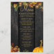 Modelo de menu de festa de aniversário com flores botânicas de outono e abóbora laranja enferrujada sobre uma madeira de celeiro escuro com luzes de corda.