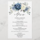 Menu de casamento floral azul empoeirado com buquê elegante de azul marinho, azul real, branco, ouro, marfim de champanhe, rosa de cor escamosa, botões de flor ranunculus e folhas de eucalipto verde-sábio e buquê de aquarela elegante. Entre em contato comigo para obter ajuda sobre a personalização ou se você precisar de outro produto com este design.