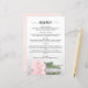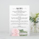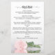 Esses lindos menus de casamento são simples, elegantes e na moda, enquanto ainda são amigáveis e baratos. Eles apresentam uma design elegante e glamourosa com um título de caligrafia de script e um rosa cor-de-rosa solteiro rosado refletindo em uma piscina de água com ondas e ondulações. A parte de trás é uma bela cor rosa pálida e pálida, com os nomes do casal e a data do casamento no fundo.