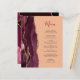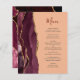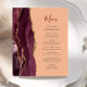 A borda esquerda deste elegante cardápio moderno de casamento mostra uma cor vermelha-de-água borrifada, bordada com uma falsa brilha dourada. O texto personalizável combina o script de escrita manual burgundy e a fonte da placa da cinza de carvão em um fundo de pêssego. O lado inverso apresenta uma burgundy e uma design de agata dourada.