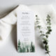 Cena de pinheiros da floresta impermeável, cardápio de casamento. Características, tipografia negra moderna com coordenação de cor verde-escura.