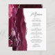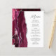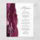 A borda esquerda deste elegante cardápio moderno de casamento mostra uma cor d'água bordona agate design aparada com falso brilho prateado. O texto personalizável combina o script de escrita manual de cinzas de carvão e as fontes sans serif em um fundo branco. O design de burgata e agata prateada é repetido do lado oposto.