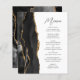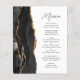 A borda esquerda deste elegante cardápio moderno de casamento apresenta uma design de agata preta, cortada com falso brilho dourado. O texto personalizável combina o script de escrita manual de cinzas de carvão e as fontes sans serif em um fundo branco. O design de agata preto e dourado é repetido no verso.