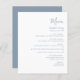 Este simples cardápio moderno de casamento contém um texto azul empoeirado sobre um fundo branco. A palavra "Menu" aparece na caligrafia na moda. Adicione o nome do casal e a data do casamento em script e itálico, juntamente com os detalhes do menu na fonte sans serif. O reverso é uma sombra correspondente de azul poeirento sólido.