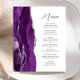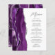 A borda esquerda deste elegante cardápio moderno de casamento apresenta um design de agata roxo, cor d'água, aparado com falso brilho prateado. O texto personalizável combina o script de escrita manual de cinzas de carvão e as fontes sans serif em um fundo branco. O design de agato roxo e prateado é repetido no verso.