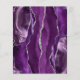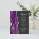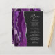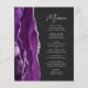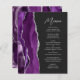 A borda esquerda deste elegante cardápio moderno de casamento apresenta um design de agata roxo, cor d'água, aparado com falso brilho prateado. O texto personalizável combina o script de escrita manual de cinzas prateadas e as fontes sans serif em um fundo preto de ardósia escura. O design de agato roxo e prateado é repetido no verso.