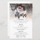 Menu de Casamento de Script de Foto de Orçamento. Um tamanho maior de 5,5 pol x 8,5 pol a um preço orçamentário, uma tipografia informal definida a preto para o menu principal que complementa o resto do texto que você pode personalizar facilmente. Substitua a foto de exemplo pelo seu favorito.