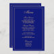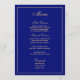 Uma maneira elegante de mostrar aos seus convidados as opções do menu. Num tom de médio azul real com escrevendo de ouro. Uma fonte elegante de casamento de script foi combinada com um estilo moderno, com uma fonte de todos os bonés criando um cardápio de casamento na moda, mas amigável. Foi alocado um amplo espaço para as opções do menu. O reverso do cartão tem pontos de ouro finos. Esta é parte da nossa Coleção de Casamentos de Passaportes onde encontraremos itens de casamento em azul e ouro.