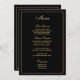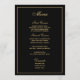 Uma maneira elegante de mostrar aos seus convidados as opções do menu. A preto com ouro escrevendo. Uma fonte elegante de casamento de script foi combinada com um estilo moderno, com uma fonte de todos os bonés criando um cardápio de casamento na moda, mas amigável. Foi alocado um amplo espaço para as opções do menu. O reverso do cartão tem pontos de ouro finos. Esta é parte da nossa Coleção de Casamentos de Passaportes onde encontraremos itens de casamento combinados e coordenados em preto e ouro.