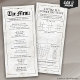 Aumente sua recepção de casamento com nossa Modelo de Menu de Casamento com Jogos de Acolhimento. Este modelo elegante não só destaca seu menu como também apresenta vários jogos divertidos no verso para manter seus convidados entretidos enquanto aguardam suas refeições. Fácil de personalizar e perfeito para adicionar um toque exclusivo ao seu dia especial. Torne o seu casamento memorável com este na moda e modelo de cardápio divertido!