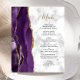 A borda esquerda deste elegante cardápio moderno de casamento apresenta uma cor d'água roxa, borda agitada com falso brilho dourado. O texto personalizável combina um script de escrita manual dourado com uma letra preta em uma cinza e um fundo de textura de mármore branco. O verso apresenta um design de agate roxo e dourado correspondente.