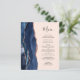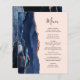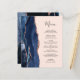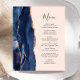 A borda esquerda deste elegante cardápio moderno de casamento apresenta uma marinho azul de aquarela agata bordada com falso brilho rosa de ouro. O texto personalizável combina o script de escrita manual e as fontes de impressão em cinzas de carvão em um plano de fundo cor-de-rosa pincelado. O verso apresenta um design marinho de agate azul e rosa dourado correspondente.