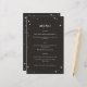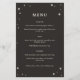 Este cardápio de casamento celestial faz parte de uma coleção inspirada em cartões tarot. Este design apresenta uma borda com estrelas ilustradas em uma paleta de cores preta e creme. Isso seria perfeito para um casamento celestial ou para qualquer um que queira um estilo assustador ou brutal para o cardápio do casamento.