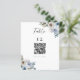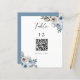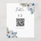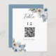 Elegante, número da mesa de casamento floral azul empoeirado e com código QR para o menu de casamento.