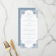Elegante cardápio de casamento azul empoeirado com um lugar floral azul empoeirado e uma letra elegante. Itens correspondentes disponíveis. Personalize facilmente esses menus azuis empoeirados com seus detalhes de casamento.