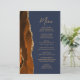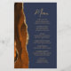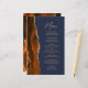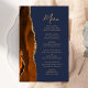 A borda esquerda deste elegante cardápio moderno de casamento apresenta uma laranja queimada e uma aquarela ferrugem borda agitada com falsa brilho dourado. O texto personalizável combina o script de escrita manuscrita de pincel dourado e as fontes sans serif em um fundo azul de marinho. O verso apresenta uma design de cor laranja queimada e dourada.