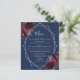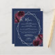 Este elegante menu de casamento moderno apresenta uma moldura geométrica prateada decorada com buquês florais de burgundy e prata num fundo azul marinho. O texto personalizável combina a escrita manual imétrica de cinzas prateadas, a placa de cobre e as fontes itálicas.