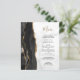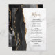A borda esquerda deste elegante cardápio moderno de casamento apresenta uma coloração aquosa preta, borda agitada, aparada com falso brilho dourado. O texto personalizável combina um script de escrita manual dourado e uma fonte de impressão preta num fundo de mármore branco e cinza. O verso apresenta um design de agate preto e dourado correspondente.