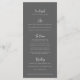 Menu monótono de desenho simples moderno, cinzas escuras com texto branco no verso. Perfeito para um simples casamento de cor de laranja moderna. Personalize este design de convite de casamento cor de laranja com seus próprios detalhes de menu de quatro cursos. Outros itens correspondentes disponíveis. Arte de mão com flor de laranja, por Sarah Trett, para www.mylittleedenweddings.com