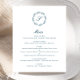 Este elegante menu de casamento apresenta um monograma clássico de script, inicialmente enquadrado por uma coroa azul teal de folhagem. Substitua o texto da amostra de chá pelos detalhes do menu de recepção. O reverso é sólido.