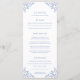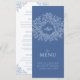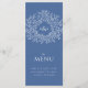 Menu de janto de casamento azul e branco de médio. Edite este menu de 4 cursos com o seu próprio texto de opção de refeição. Folhas simples mas modernas desenhadas à mão e design monograma. © Original desenho e design por Sarah Trett para www.mylittleedenweddings.com exclusivamente em zazzle.