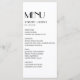 Um cartão de menu elegante para o seu janto de casamento. Este cartão preto e branco apresenta uma tipografia negra moderna com o título Menu. Personalize com os nomes da noiva e do noivo, data do casamento e menu. Todo o texto na frente é deixado justificado. O verso é preto com as iniciais do casal em branco separadas por uma seringa embebida
