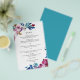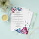 Menu de Casamento do orçamento floral moderno (impresso em papel de impressora fino) com peões e rosas em cor-de-rosa arrojado e vibrante com cinzas verdes em tons de lacre e azul. A parte de trás é uma sombra de azul lacrimejante. Este brilhante Menu Casado em cores de tom de joia é excelente para um casamento de verão.