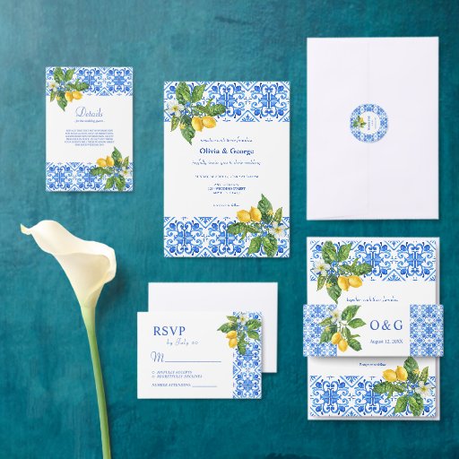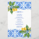 Azulejos azuis mediterrânicos e menu de casamento de limões.