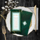 Um fundo de aquarela em tons de verde esmeralda é tocado por um abstrato de linhas de ouro finas e efeitos de iluminação reluzentes para criar as peças desta bela suíte de casamento. O cartão 'Menu' do casamento mostrado aqui também apresenta elegantes quadros de caligrafia e gradiente para segurar seu texto tanto na frente quanto no verso. Adicione facilmente suas próprias iniciais, data do casamento e seleções de menu usando a modelo fornecida. Procure ID867 para ver outras peças e opções de cores para este conjunto.