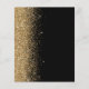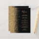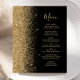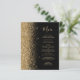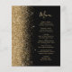 A borda esquerda deste elegante menu de casamento moderno apresenta uma borda falsa dourada. O texto personalizável combina o script de escrita manual branco dourado e as fontes de impressão em fundo preto. O verso apresenta um design de brilho preto e dourado correspondente.