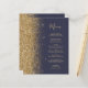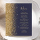 A borda esquerda deste elegante menu de casamento moderno apresenta uma borda falsa dourada. O texto personalizável combina um script de escrita manual branco de cor dourada e fontes de impressão em um fundo azul escuro. O verso apresenta um design de brilho azul escuro e dourado.
