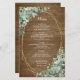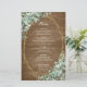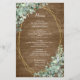 As opções do menu de casamento são enquadradas com buquês de eucalipto verde numa moldura geométrica dourada. As costas têm um fundo de madeira rústico.