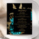 Este elegante menu de casamento, humorístico, apresenta um buquê floral romântico e luxuoso em turquesa com folha de ouro e folhagem brilhante num fundo negro. Personalize o texto dourado em fontes na moda em um retângulo preto. A parte traseira da placa é preta e sólida.