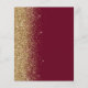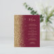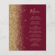 A borda esquerda deste elegante menu de casamento moderno apresenta uma borda falsa dourada. O texto personalizável combina um script de escrita manual branco de cor dourada e fontes em um fundo vermelho burgundy. O verso apresenta um design de burgundy e dourado.