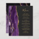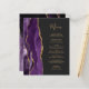 A borda esquerda deste elegante cardápio moderno de casamento apresenta uma cor d'água roxa, borda agitada com falso brilho dourado. O texto personalizável combina o script de escrita manual dourado e as fontes de impressão em um plano de fundo off-black. O verso apresenta um design de agate roxo e dourado correspondente.
