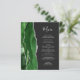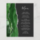 A borda esquerda deste elegante cardápio moderno de casamento mostra um caçador de aquarela verde agata bordada com falso brilho prateado. O texto personalizável combina a escrita manual e as fontes de impressão em cinza prateada em um fundo fora do preto. O verso apresenta um design verde e prateado correspondentes.