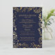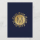Padrão elegante, moderno e fino dourado e marinho azul de tendências desenhado à mão floral, cartões de menu de recepção de casamento. Este design clássico e sofisticado é perfeito para a recepção de casamento clássica, na moda e de tendências. Personalize com seu próprio menu na frente, junto com seus nomes e datas. Então personalize o dorso com seu monograma inicial. Todas as impressão de fotos.