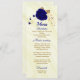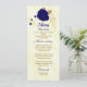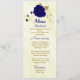 lindas flores azuis reais e ouro deixam um belo cardápio de casamento.