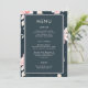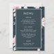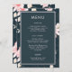Um lindo cardápio de casamento clássico com padrão floral magnético apresenta um delicado padrão botânico de flores cor-de-rosa e um fundo azul escuro.