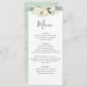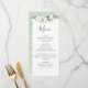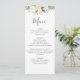 Nosso moderno cardápio de casamento apresenta um arranjo branco e neutro de flores aquáticas.