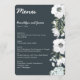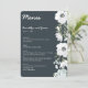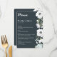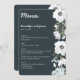 Menu de casamento Floral com flores brancas e texto personalizável impresso em fundo escuro