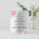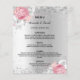Um menu de casamento elegante. Um fundo com aspecto fino prateado, decorado com rosas rosa e brancas, florais. Personalize e adicione seus nomes, data e menu de casamento.