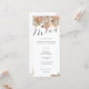 Este elegante design de cardápio de casamento apresenta lindas flores do outono com grama-palma, flores secas e lanças de palma, acabadas com a tipografia clássica da caligrafia. Um design de cardápio clássico para vestir suas mesas lindamente e combinar com seu tema de casamento de outono através de suas ideias de decoração de casamento.