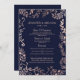 Rosa de ouro elegante, moderno e chic, padrão desenhado floral azul de marinho azul de tendências, cartões de menu de recepção de casamento. Este design clássico e sofisticado é perfeito para a recepção de casamento clássica, na moda e de tendências. Personalize com seu próprio menu na frente, junto com seus nomes e datas. Então personalize o dorso com seu monograma inicial. Todas as impressão de fotos.