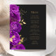 Este elegante cardápio moderno de casamento mostra uma borda de flores roxas e folhas de folhas falsas douradas. Personalize o texto em itálico dourado em um fundo preto de ardósia escura. A parte de trás do menu é a barra sólida preta,