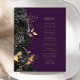Este elegante cardápio moderno de casamento mostra uma borda de flores pretas e folhas de folhas falsas douradas. Personalize o texto em itálico dourado em um fundo roxo escuro. A parte de trás do menu é roxa sólida.